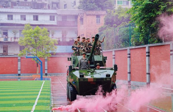 伴隨著隆隆轟鳴,ST-1輪式裝甲突擊車慢慢駛入操場,瞬間點著全場氣氛。同學們分批登車體會。